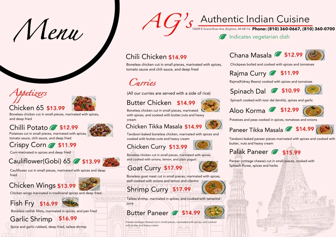 AG's Indian Cuisine is the premier location for Indian food in the Brighton Howell Area. Visit their Brighton location for the diverse, expansive menu and stay for the welcoming atmosphere. The kitchen team proudly offers an authentic dining experience with fresh, bold flavors. The appetizer and naan choices are the perfect way to start your meal. The naan bread is strong but flaky, ideal for eating the rice and accompanying sauces. Familiar favorites on the menu include the butter chicken and the Hyderabad Dum chicken biryani. You can also order varieties of biryani, breads, chutneys, and unique beverages. The menu highlights dishes native to Southern India, so prepare for some spice! However, it also offers several Indian-inspired dishes, like AG’s special potato steaks and potato 65. When you see ""65"" on the menu, it refers to the signature blend of AG's Indian Cuisine spices. Visit on a weekday to enjoy two mix-and-match lunch combinations.