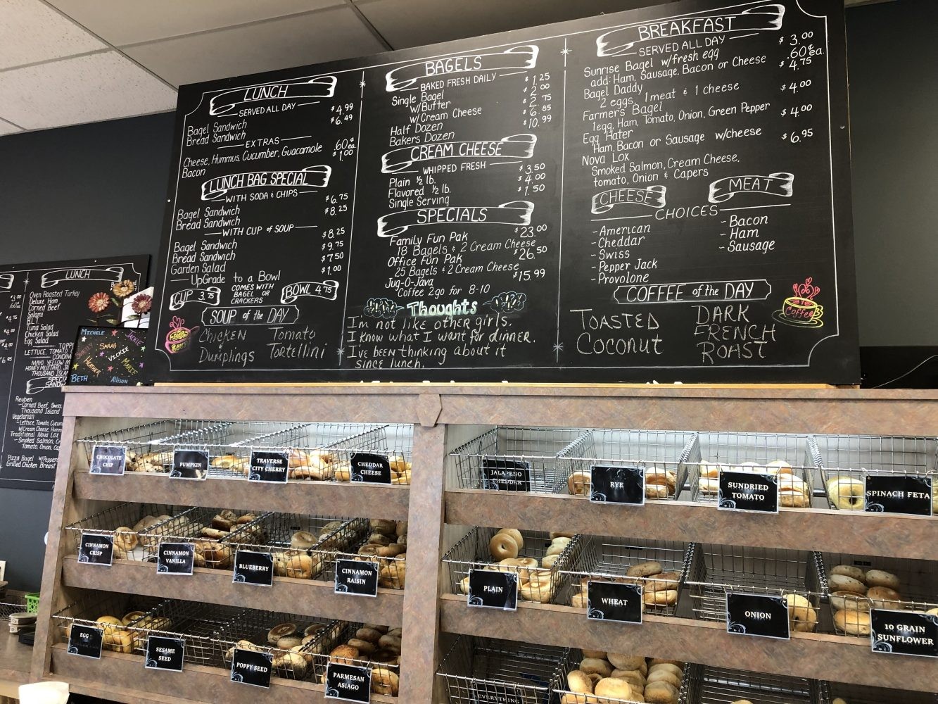 Bagels & Bites Cafe is a friendly spot full of fresh-baked breakfast and lunch options. This family-owned and operated cafe in Brighton offers indoor and outdoor dining and catering around the area. This little coffee spot serves up a wide variety of bagels that some of you've likely never heard of before. Tasty coffees, teas, cappuccinos, lattes, smoothies, and more are available to order to drink. From food to drink, Bagels and Bites Cafe is committed to providing tasty, low-fat alternatives to your typical breakfast. Bagels vary from sweet to savory, including flavors like jalapeno cheddar, sun-dried tomato, spinach feta, chocolate chip, and parmesan asiago. The list of fresh-baked items also includes scones, muffins, cookies, and health bars. The breakfast menu provides additional sandwich-style options, including the farmer's bagel, Nova Lox, and sunrise bagel. For lunch, Bagels and Bites is also proud of its great deli. Choose from classic and unique sandwiches and sides, with a bonus of healthy foods. Your lunch flare can come with any sandwich on traditional bread or a bagel. You can even get the lunch bag special with either a pop and chips or a cup of soup or salad with a pop.