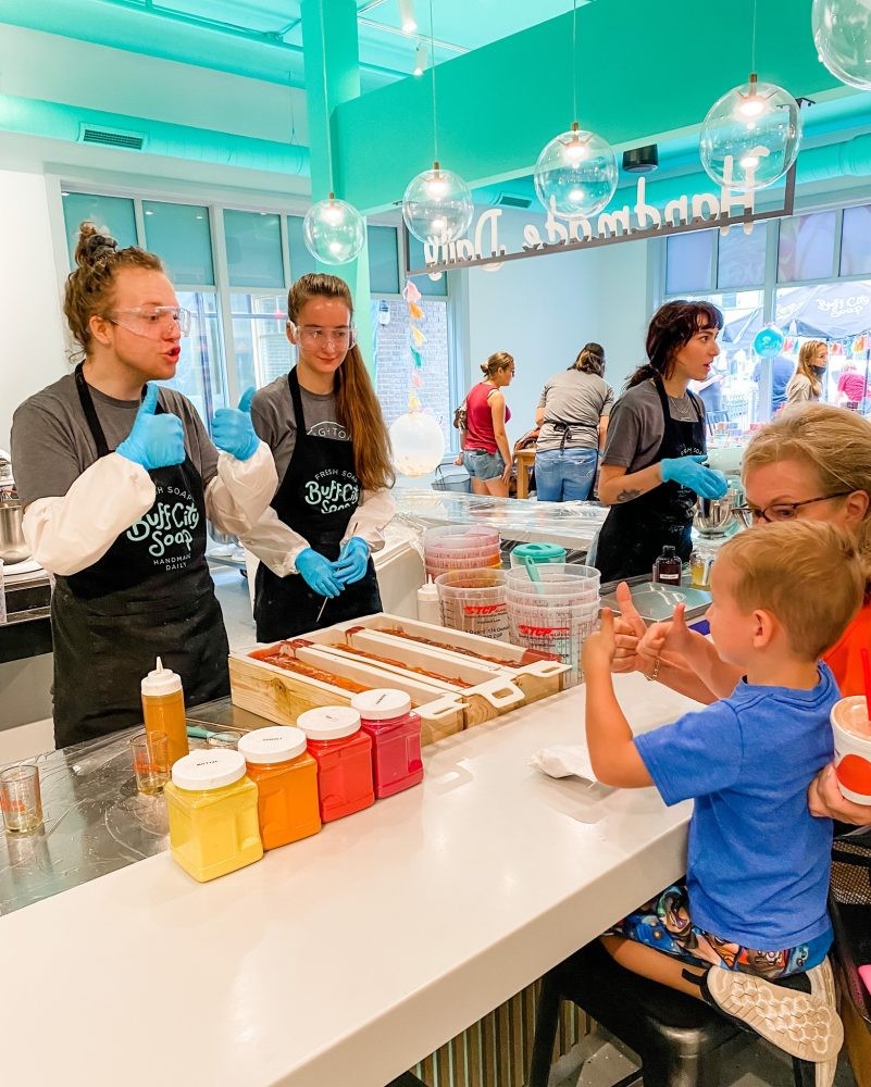 Buff City Soap is on a mission to make the world smell wonderful, one handcrafted soap at a time, starting in the Brighton Howell Area. This shop carries a special line of products, including laundry soap, whipped body butter, bath bombs, body scrubs, and more. The storefront is located on Main Street in Downtown Brighton; as you walk by, the alluring scent of fresh soap will pull you in. The most popular product is their handmade bar soaps, which are hand-mixed, hand-poured, and hand-cut every day in-store using natural ingredients. Not only are the designs and colors pleasing to the eye but there are also countless scents to choose from. All the soap products are handmade daily at the store. Other products their visitors love include laundry soap and dryer balls, free of harsh chemicals, detergents, and preservatives. Shop all their unique products, including beard oil, shower fizzes, and shave soap. Frustrated by commercial soaps’ harsh chemicals, detergents, and animal fats, they set out to create a better soap. Buff City Soap is delightfully scented plant-based soap used to create bath bombs, laundry soap, and more. Buff City Soap is ready to bring a soap-making workshop to you or host your next event in-store! Choose from 3 different party packages: a kids' birthday bash, a ladies' night out, or a build-your-own special event.