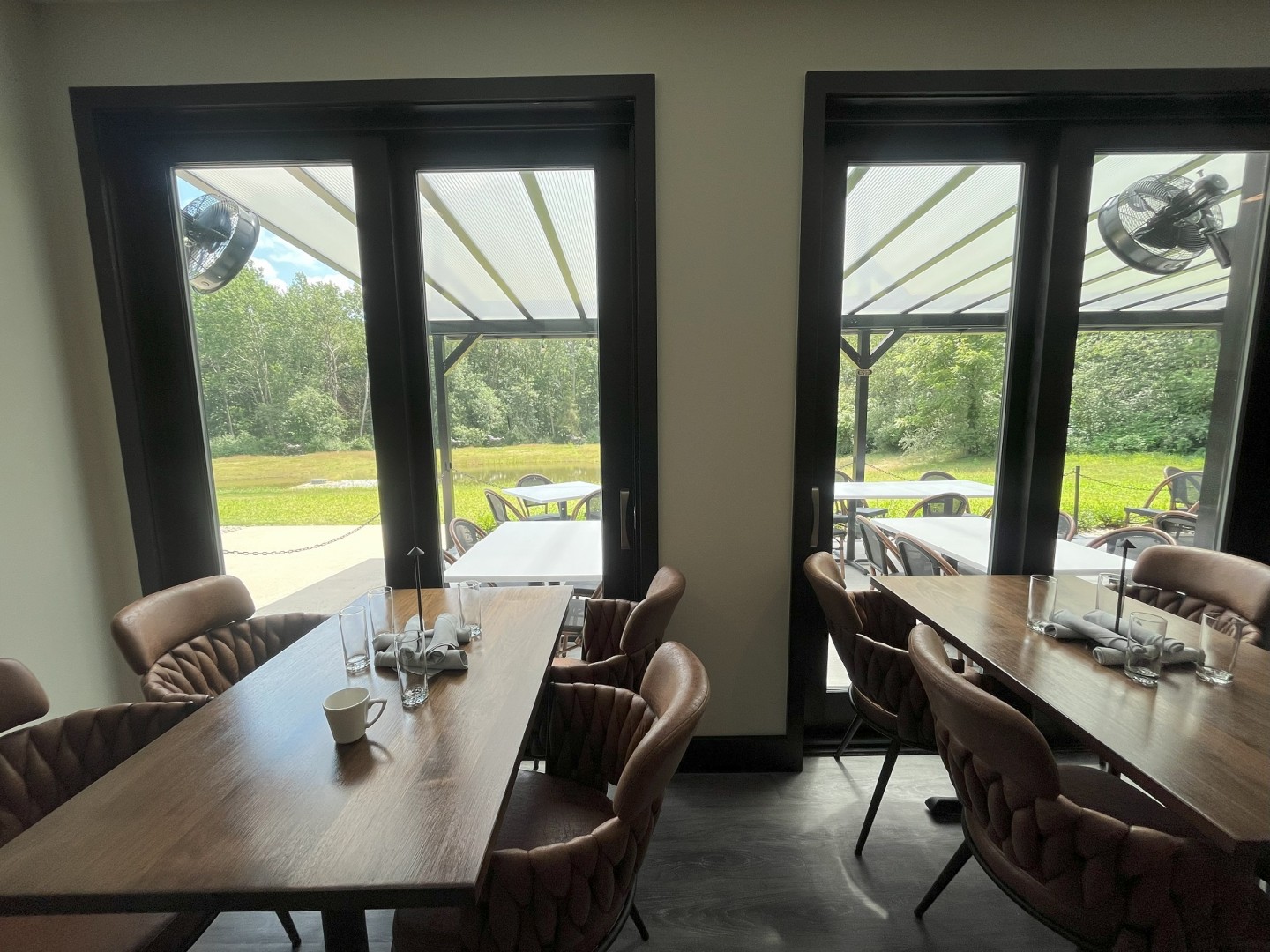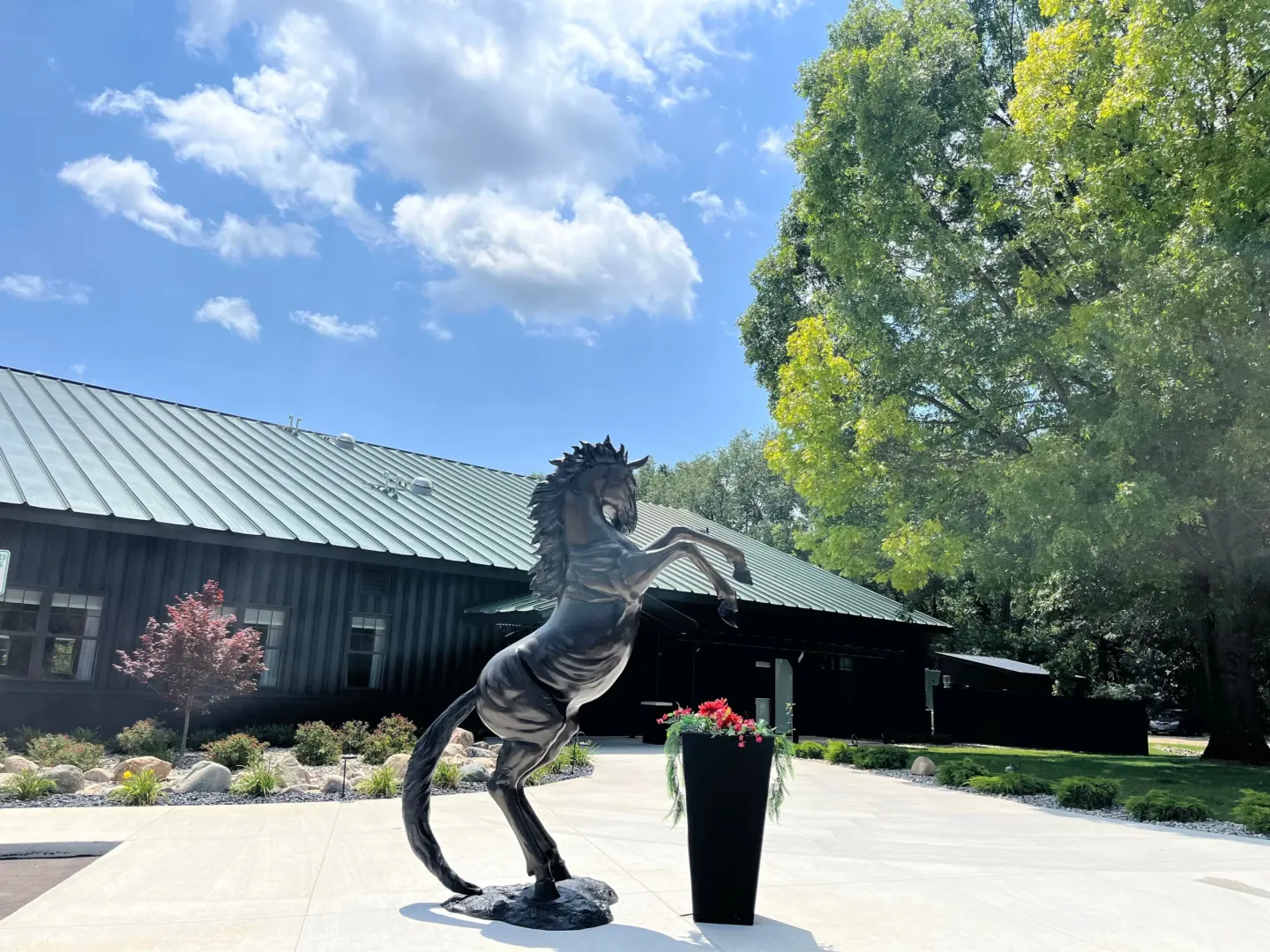 As you enter the building, prepare to be taken away by the unique equestrian flair throughout the spaces. Greeting you at the front door is a giant bronze statue of a horse and an elegant hallway with plush seating options leading to the Horse Feathers Kitchen and Cocktails entrance. The space's white walls and bold features offer an environment that hardly makes you feel like you're in the woods. The tables have options for large booths, chair seating, and a mix of the two. The piece de resistance is the marble bar surrounded by chairs that hug you with soft leather. You'll notice a large stone patio on the left side of the entrance that belongs to the adjoining Reserve Event Center. The outdoor patio has several tables for use all year, and the above awning blocks most of the UV, so you can dine in any element. The restaurant rests on land surrounded by trees and features a pond in the back with additional sculptures. You'll see them lit up beautifully when you eat outside at night, reflecting off the water.The Food