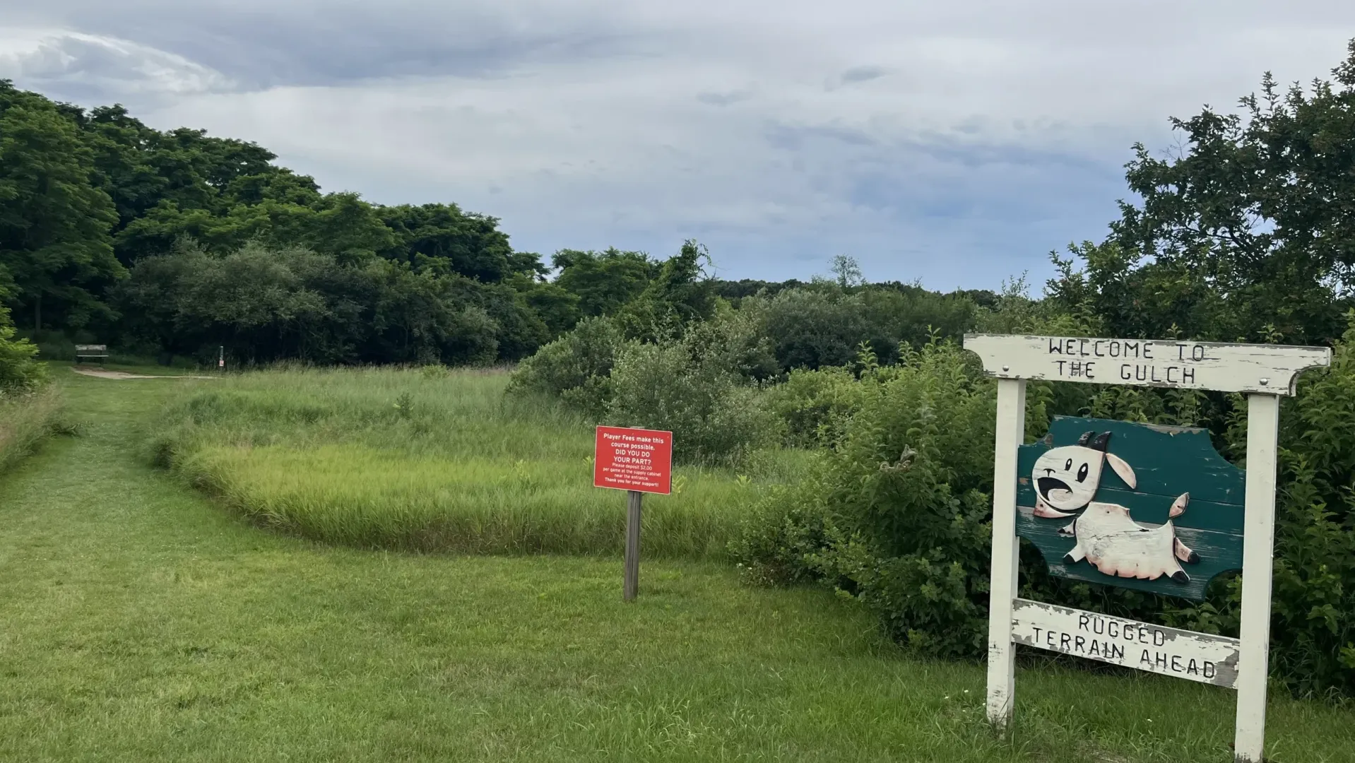 Merrill Field Disc Golf Course also known as ""The Gulch"" is a player-friendly, hilly course in Manly Bennett Park. This course has been a favorite for locals and visitors for over ten years. Located just a few hundred feet off the Mike Levine Lakelands Trail, you can hike and play disc golf to make a dynamic outdoor day. Throughout the Gulch Disc Golf Course's eighteen holes, you'll experience elevation changes and gorgeous landscapes. Each tee has a concrete starter pad and green pole indicating how many feet to the hole. Half of the holes have options for beginner and professional footage to offer multiple kinds of play. The cost to play is a suggested $2 per round; all money goes to maintaining the course. Across Merrill Road, there are restrooms and an abundance of park facilities.