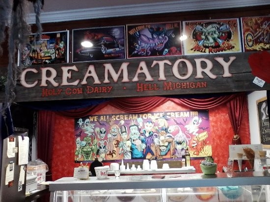 The Screams Souvenirs from Hell & Helloween is the one-stop shop for all things Hell, Michigan! As the only officially incorporated Hell, this iconic souvenir shop is the main attraction for people worldwide. Screams Souvenirs from Hell & Halloween is the only store of its kind in the Brighton Howell Area, with plentiful activities and a diabolical amount of fun. When you get inside, the walls and display tables are full of all the hell-themed paraphernalia you could think of. Screams is a hilarious store with T-shirts, glassware, and other souvenirs from Hell. It is the only place where you can celebrate Halloween all year long. The official post office is inside this building, too. The office will take your mail and stamp ""Been Thru Hell"" on every letter, which may result in scorching marks. The experience at this store is a trip in itself. When you stumble upon this shop, you'll see just as many attractions and activities outside the Screams store. Make sure to grab your matching clubs and golf balls inside the store to play a round of putt-putt! This miniature golf course features 18 holes and is next to giant posters with head cutouts, which are perfect photo opportunities for you under the official Gates of Hell.The Creamatory At Screams